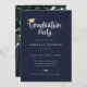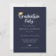 Écriture blanche joueuse avec accent de casquette de graduation dorée, invitation à la fête de graduation. Caractéristiques, arrière - plan bleu marine et photo unique sur le dos.