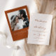 Faire-part de mariage en terre cuite moderne et chic avec script de calligraphie élégant et initiales monogrammes personnalisées avec code QR personnalisé, photo personnalisée et informations plus mariages détaillées sur le dos.