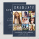 Faire-part moderne de graduation bleu foncé et invitation de fête avec "GRADUATE" en gros caractères blancs, un collage de sept photos et le nom du diplômé, l'année de classe et l'école en simple typographie blanche. Ajoutez les détails de la grande fête sur le dos.