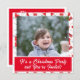 Le design présente votre photo sur le devant, avec l'arrière - plan à motifs des casquettes Père Noël, des bas de Noël et des sucres de canne. La zone Centrale avant affiche votre texte en blanc cursif contre un support rouge rectangulaire. Le côté inverse comporte un arrière - plan tout-rouge à votre texte, affiché dans la même police blanche et cursive. Les informations sur l'heure et le lieu sont affichées dans une impression facile à lire. Conçu pour coordonner avec la première collection de Noël