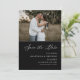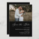 Cette photo Save the Date - présente un texte manuscrit blanc et élégant avec place pour votre photo. L'envers de l'invitation est noir laconique.