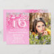 Photo Pink Parties scintillant 16e anniversaire Invitation Girly Pink Parties scintillant anniversaire invitation pour une fille de 16 ans avec écriture de script moderne et des ballons de papier amusant.