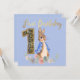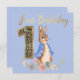Pierre le Lapin sur Fond Bleu avec texte « Premier anniversaire » en or avec le numéro un en or.