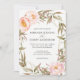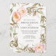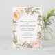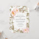 Une belle couronne fleurie aux pignons roses et verdure encercle le texte de cette faire-part de mariage design.