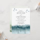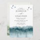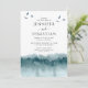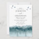 Une invitation à thème rustique de la forêt de pins de montagne aquarelle de la forêt mariage. La brume douce, sereine et éthérée, avec des oiseaux qui s'envolent au-dessus. typographie serif élégante, et le paysage forestier de montagne se poursuit à l'arrière de l'invitation. Bleus et verdure éthérés doux