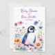 Un mignon pingouin de bébé entouré de fleurs rose, bleu, orange et violet aquarelle illustration invitation de la petite fille douche bébé.