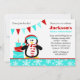 Une invitation branchée à la fête d'anniversaire hivernale au pays des merveilles. Doté d'un pingouin, de flocons de neige, de gâteau d'anniversaire et d'une bannière de bottes. Fait un grand invitation pour une fête d'anniversaire de garçon ou de fille d'hiver. Affiché en bleu et rouge turquoise.