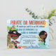 African American Pirate and Mermaid Double Anniversaire : Ahoy là ! Cette invitation absolument géniale présente un pirate sur une île avec son trésor. Aussi une sirène mythique jouant sa harpe sur une vague. Une merveilleuse invitation à une fête conjointe de frères et soeurs. Convient aux filles ou aux garçons. Il invitation leurs amis à choisir de s'habiller comme ils le souhaitent, un pirate ou une sirène. Ne soyez pas un poisson hors de l'eau cette invitation aux sirènes de pirates afro-américaines est juste l'invitation pour un anniversaire extravagante !