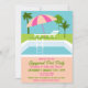 Une invitation à la fête de la piscine fiançailles. Dotée d'un graphique représentant une piscine, un transat, un parasol et des palmiers. Un invitation moderne aux ambiances estivales tropicales qui peut être facilement personnalisé.