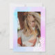 Une invitation à l'anniversaire de sweet sixteen à thème de la plage tropicale avec une planche de surf rose cool avec palmier tropical modifiable, feuilles de palmiers, sur un lavage à l'eau violet bleu, ajoutez votre photo à l'arrière. Parfait pour la fête 16 sucré d'été.