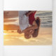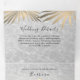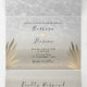 Invitation simple, moderne, tropicale, été, 3 en 1 pour mariage sur la plage, avec feuilles de palmier dorées, sable et vagues de l'océan et photo du couple.