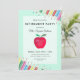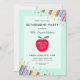 Cette invitation colorée à la retraite est conçue pour un enseignant. L'arrière - plan est vert clair avec un motif de crayons colorés et une pomme rouge.