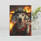 Un chien dalmate courageux vêtu comme pompier, devant une scène brûlante avec des étincelles qui volent. Le chien porte un casque de feu et un équipement de protection, symbolisant courage et héroïsme.