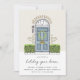Une jolie invitation à la fête de vacances présente une illustration esquissée de porte bleue flanquée de buissons verts, avec des lettres manuscrites chic "maison de vacances". Personnalisez avec les détails de votre fête de Noël en dessous.