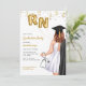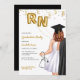 Portrait Infirmière école de sciences infirmières Invitation de la fête de graduation. Invitation d'infirmière pour votre fille, nièce, mère, tante, cousin ou ami qui est diplômé de l'école de soins infirmiers et qui est maintenant officiellement infirmière. Invitation pour les grandes fêtes célébrant les femmes qui viennent d'obtenir leur diplôme de l'école de soins infirmiers. Célébrez la nouvelle infirmière autorisée avec cette élégante invitation de graduation en soins infirmiers! Portrait d'une peau claire, plus la taille femme cheveux brun-rouge ondulé. L'infirmière grad porte une robe blanche élégante, une robe noire de graduation drapée sur son épaule et une casquette noire assortie. Elle tient des ballons de style feuille d'or avec les lettres RN d'une main et un stéthoscope de l'autre. Accentée de confettis dorés chatoyants, elle saisit parfaitement la joie et l'excitation de sa grande réussite.
