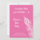 Un grand plumage de paon blanc décore cette invitation de fête de poules sur fond rose avec la phrase mignonne, Préparez-vous à secouer vos plumes ! ce qui la rend parfaite pour une soirée en ville à danser pour célébrer la mariée.