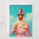 Un élégant poulet anthropomorphe portant des lunettes de soleil et un costume rose fleuri pose en toute confiance sur un fond de ciel onirique, tenant une étiquette blanche.