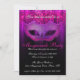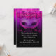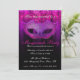 Invitation pour célébration de fête masquée rose et violet. Une invitation élégante et sophistiquée présentant un masque de mascarade de teintes violettes et roses avec des fioritures noires, un fond de teintes violettes/roses avec un motif damassé subtil se fondant dans le noir et un texte élégant qui peut être personnalisé pour les détails de votre fête.