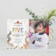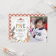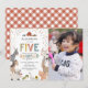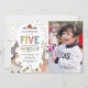 Cartes d'invitation pour la 5e fête d'anniversaire avec une jolie ferme et une zone de contact avec les animaux, sur fond blanc simple, une photo de votre bébé, des animaux de ferme adorables dont une vache, une chèvre, un cochon, un mouton, un âne, un cheval, un lapin, un canard et un coq, et un modèle de célébration d'anniversaire pour enfants facile à personnaliser.