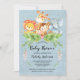 Fête de bébé sur le thème d'une safari dans la jungle aquarelle mignonne avec une girafe, un lion, un singe et un éléphant adorables avec des feuilles de jungle et des fleurs roses sur un fond en toile de jute bleue parfait pour une fête de bébé garçon. Visitez notre boutique pour voir ce design en rose pour une fête de bébé fille.