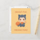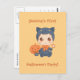 L'adorable bébé habillé d'un costume de chat noir avec un gros arc orange tient une sucette avec une image crânienne. Un citrouille courbé se tient juste un peu en arrière. Première invitation de fête d’Halloween du bébé, n’importe quel sexe.