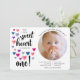 Chérie invitation de premier anniversaire. Coeurs d'aquarelle violet, bleu et rose avec une photo de l'enfant d'un an ! Les tons bijoux sur un arrière - plan blanc croustillant, cette invitation est la plus douce.