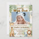 Cette charmante invitation "Petit sauvageon" présente une illustration aquarelle d'un girafe, d'un lion, d'un éléphant et d'un singe associée à une palette de couleurs or et verte pour créer une atmosphère de safari fantaisiste et moderne. Cette invitation est parfaite pour les parents qui cherchent une façon mignonne et unique de célébrer leur petit aventurier.
