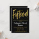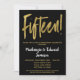 Une invitation élégante, simple mais frappante, noire et dorée pour les 15 ans d'anniversaire de mariage. Texte de script glamour en haut et texte doré en bas avec le nom en blanc qui ressort