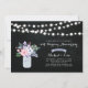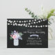 Une invitation d'anniversaire de mariage rustique élégante avec un pot mason et un bouquet de fleurs sur fond de tableau noir.