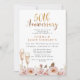 Invitation bohème pour les 50 ans de mariage avec des fleurs roses et un titre en calligraphie dorée ainsi que deux verres à champagne. Le verso de l'invitation comporte une image en dorure.