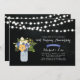 Une invitation d'anniversaire de mariage rustique élégante avec un pot mason et un bouquet de fleurs sur fond de tableau noir.