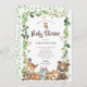 Conception de baby shower pour garçon ou fille sur le thème des animaux de la forêt, avec un cadre de feuilles botaniques et un hibou, un ours, un renard, un castor, un raton laveur, un cerf et un lapin. Retournez notre design pour voir l'arrière assorti avec des feuilles pour un effet spécial.