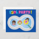 Invitations de fête en piscine incroyables pour l'anniversaire d'une fille en été. Caractéristiques une explosion de couleurs vives et amusantes sur un fond bleu marine. Des enfants adorables en train de nager se détendent dans une jolie piscine ovale avec un plongeoir.
