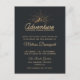 Une carte postale d'invitation à une fête d'anniversaire avec une illustration de couleur or sur un fond gris-noir. Conçue avec une illustration d'une montagne avec les rayons du soleil brillant vers l'extérieur depuis l'arrière. La typographie dit : Aventure explorer rêver découvrir.