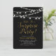 Célébrez un jour spécial avec cette invitation de fête surprise en or ! Ce design présente une typographie de script stylée avec une texture de paillettes dorées et une chaîne lumineuse sur fond noir. Vous pouvez personnaliser la couleur de fond.