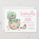 Invitez vos invités à passer un moment "dino-mite" à la première fête d'anniversaire de votre petite fille avec cette invitation dinosaure Wild One qui présente un Triceratops mignon avec un bandeau à fleurs rose et des empreintes de dinosaure rose et vert menthe. Parfait pour les thèmes jurassiques et préhistoriques. Œuvre originale KL Stock