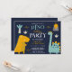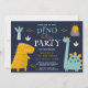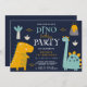 Jolie fête de dino peinte 1er anniversaire invitation pour les garçons ou les filles, avec une scène préhistorique colorée du monde de dino. Une police d'apparence décalée avec des types colorés d'oranges, de bleus et de blanc. L'envers des invitations présente un arrière - plan sombre avec un grand dinosaure marchant. Ajoutez le nom de votre enfant et les détails de la fête. Style enfant moderne et dynamique.
