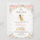 Pink Floral Fairy and Fairy Dust First Birthday Sweet girl's fairy ou fées thème invitation anniversaire pour une fête de premier anniversaire. Ce design est composé d'une fée d'or imitation, de poussière passable, de points de parties scintillant d'or et d'un bel arrangement floral à dominante rose.