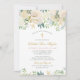 Cette élégante cérémonie de la première sainte communion et l'invitation à la fête du déjeuner pour une fille comprend un élégant libellé personnalisé pour votre événement spécial accentué par une croix d'or et une belle aquarelle fleurie avec des roses peints, des fleurs de ranunculus, et la verdure dans des tons neutres de blanc, crème, or, or rose et vert. Un arrière - plan de pêche pastel blush avec espace photo apparaît au verso de la carte. Personnalisez le texte "Dieu béni" avec le nom de votre fille dans le script.