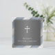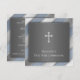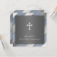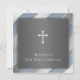 Élégantes rayures bleu ardoise et gris avec invitation de première sainte communion de garçons à croix blanche. Cette invitation de première communion bleu et gris est facilement personnalisable pour votre événement en ajoutant vos détails d'événement, style de police, taille et couleur de police, et libellé.