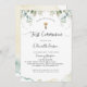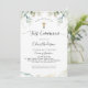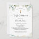 Elégante invitation à la première communion avec une exquise végétation Eucalyptus et des taches d'aquarelle. idéal pour les deux, garçon ou fille Première communion. Moderne et élégant calligraphie manuscrite détails. Possibilité d'ajouter à la fois cérémonie/sacrement et réception ou brunch, déjeuner, dîner, détails de réunion. Retour avec un bel arrière - plan aquarelle. Une partie de notre collection "Elegant Greenery Eucalyptus Mariage and Events" avec une variété de produits de coordination disponibles. Style moderne, élégant et simple.