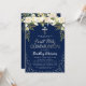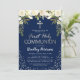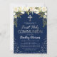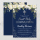Invitation moderne pour la première communion avec un fond bleu marine pouvant être changé en n'importe quelle couleur, paillettes argentées élégantes dispersées, titre en script à feuilles d'argent, croix religieuse, composition florale et modèle de première communion facile à personnaliser.