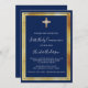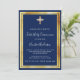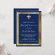 Une invitation moderne, élégante et raffinée. Un arrière - plan bleu marine décoré d'une croix, de cadres faux or. Personnalisez et ajoutez un nom et des détails. Texte blanc.