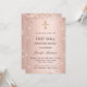 Un arrière - plan rose à l'apparence métallique. Décoré d'or rose, de poussière de parties scintillant rose et d'une croix. Personnalisez et ajoutez un nom et des détails. Le nom est écrit avec un script de style manuscrit