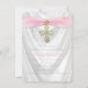 Première invitation de communion blanche de fille avec une belle croix rose et or sur une parties scintillant arrière - plan satiné blanc éparpillé. Cette jolie invitation à la première communion rose croix et parties scintillant est facilement customisée pour votre événement en ajoutant les détails de votre événement, le style de police, la taille et la couleur de police et le libellé. Tous les modèles sont imprimés sans parties scintillant réelle, bijoux, arcs, etc.