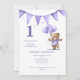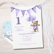 Adorable bébé ours avec ballons 1er anniversaire invitation de fête. Cette invitation est disponible en bleu et violet.