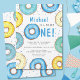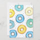 Prévoyez-vous la première fête d'anniversaire d'un garçon ? Cette mignonne invitation à l'anniversaire est décorée de beignets d'aquarelle dans les tons pastel bleu et jaune. Il y a un motif de beignes à l'arrière. Facile à personnaliser. Aquarelle originale © Michele Davies.