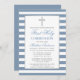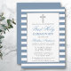 Élégante Première Sainte Communion Invitation avec Croix. Bleu et blanc poussiéreux. Croix d'argent.