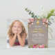 Invitation pour la première sainte communion des filles avec un fond en bois rustique, une photo de votre enfant, des paillettes dorées dispersées, un beau décor floral aquarelle rose, un titre en or script, une croix religieuse et un modèle de sainte communion facile à personnaliser.