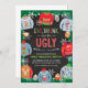 Mangez, buvez et soyez moches à votre prochaine soirée pull-over moche !! Cette invitation est le moyen idéal pour inviter vos invités à votre soirée thématique de Noël pull-over moche ou à votre fête d'anniversaire. C'est une invitation de fête amusante, parfaite pour tous les âges ! Une variété de pulls moches encadrent l'invitation avec des mugs de Noël et du houx sur un fond de tableau noir.
